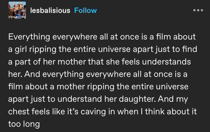 Perhaps the best way I have seen this film and therefore relationship described is through a tumblr post by @lesbalisious, who blogged “Everything everywhere all at once is a film about a girl ripping the entire universe apart just to find a part of her mother that she feels understands her. And everything everywhere all at once is a film about a mother ripping the entire universe apart just to understand her daughter. And my chest feels like it’s caving in when I think about it too long”